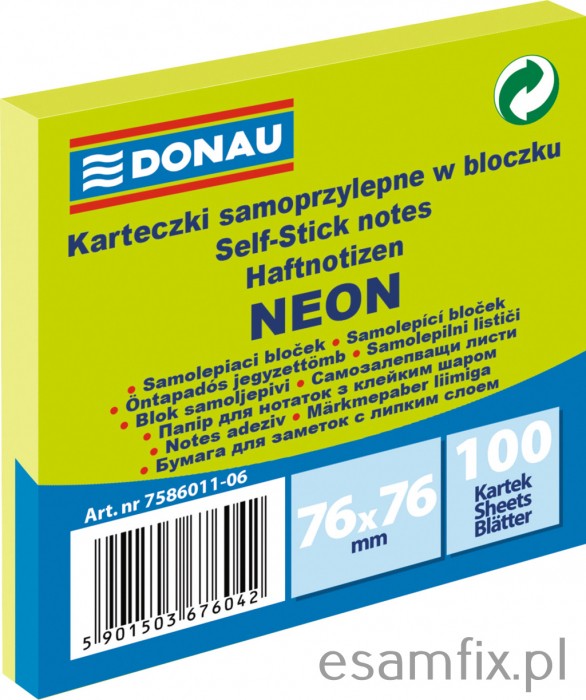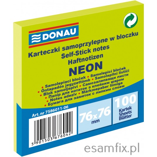 Bloczek samoprzylepny DONAU, 76x76mm, 1x100 kart., neon, zielony
