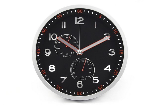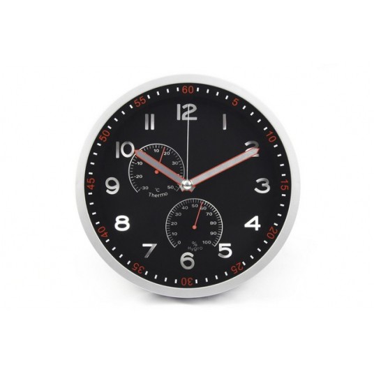 - doskonały do pomieszczeń biurowych i gabinetów - bezgłośny mechanizm kwarcowy - płynna wskazówka sekundnika - wbudowany termometr i hydrometr - zasilany 1 baterią AA - plastikowa obudowa - obramowanie w kolorze srebrnym - średnica: 300 mm