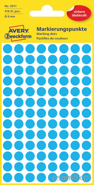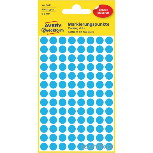 Kółka do zaznaczania O 8 mm, niebieskie etykiety papierowe, etykiety okrągłe z trwałym klejem, etykiety do oznaczenia 416 etyk. / op., Avery 3011