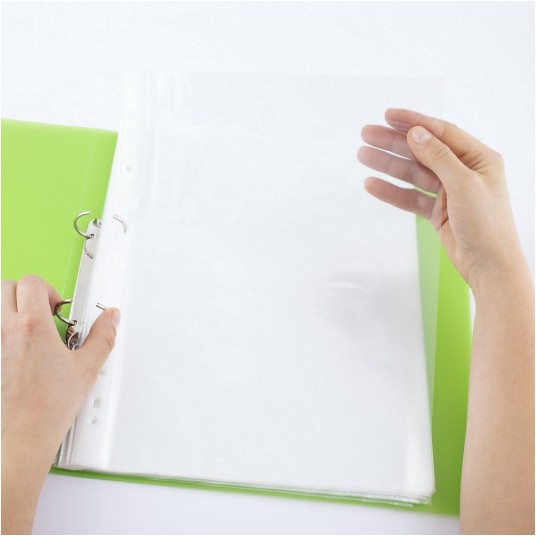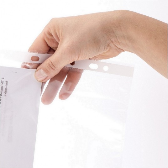 - Wzmocniony pasek z uniwersalną perforacją umożliwia wpięcie koszulek do każdego typu segregatora. Otwierane od góry.