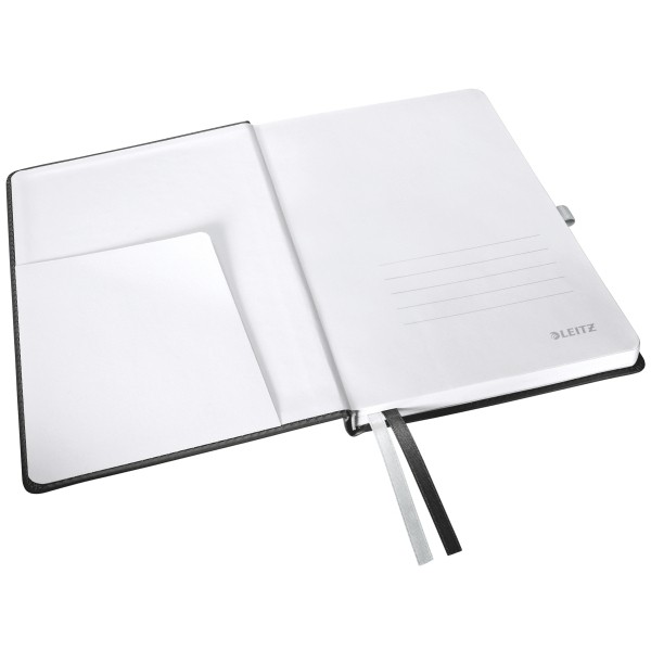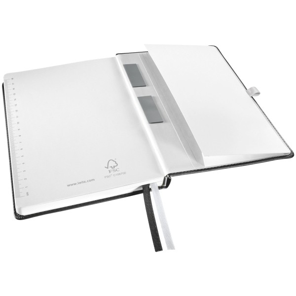 - notatnik o uznanej jakości Leitz Premium - nowoczesne wzornictwo, atrakcyjne szczotkowane wykończenie i wyrafinowane kolory - zintegrowana, poszerzana kieszeń na wewnętrznej stronie przedniej i tylnej okładki umożliwia szybki dostęp do luźnych kartek i drobiazgów - 80 kartek wysokiej jakości papieru w kolorze kości słoniowej, z certyfikatem FSC® i gramaturą 100 g/m2 - format A5, kratka