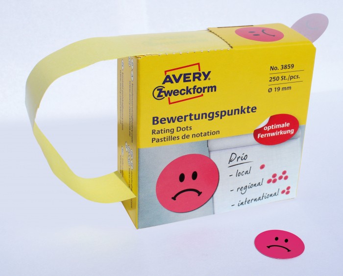 KÓŁKA DO ZAZNACZANIA Z SYMBOLAMI • W poręcznej formie dyspensera • Kółka ze wzorem smutnej buźki – idealne do łatwego i szybkiego określenia negatywnej opinii • Wyraźnie widoczne dzięki intensywnej kolorystyce • Wykonane z ekologicznych materiałów