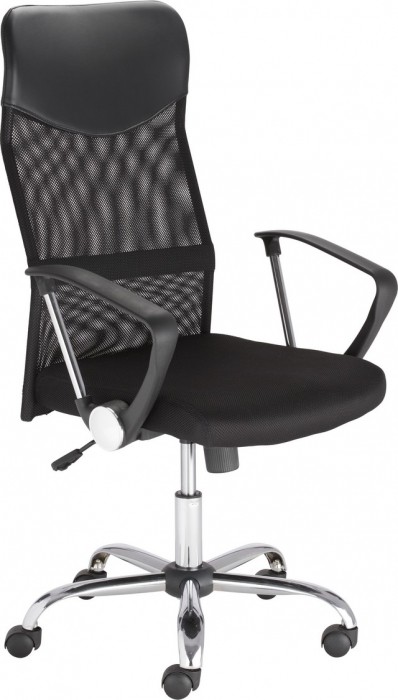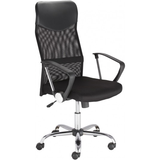 - szerokie, komfortowe siedzisko i ergonomicznie wyprofilowane wysokie oparcie - oparcie i siedzisko tapicerowane połączeniem tkaniny siatkowej i imitacji skóry oraz tkaniny w kolorze czarnym - możliwość: swobodnego kołysania się, blokady siedziska i oparcia w pozycji do pracy - regulacja siły oporu oparcia - regulowana wysokość krzesła i stałe podłokietniki - tapicerowany zagłówek - podstawa stalowa, chromowana - samohamowne kółka do powierzchni dywanowych w standardzie