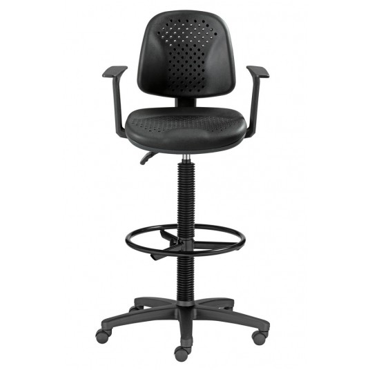 - antypoślizgowa powierzchnia siedziska i oparcia z miękkiego tworzywa PU - możliwość blokady kąta odchylenia oparcia w wybranej pozycji - regulowana wysokość krzesła - regulowana wysokość oparcia za pomocą śruby - stałe podłokietniki - podstawa czarna, plastikowa - kółka do powierzchni dywanowych w standardzie