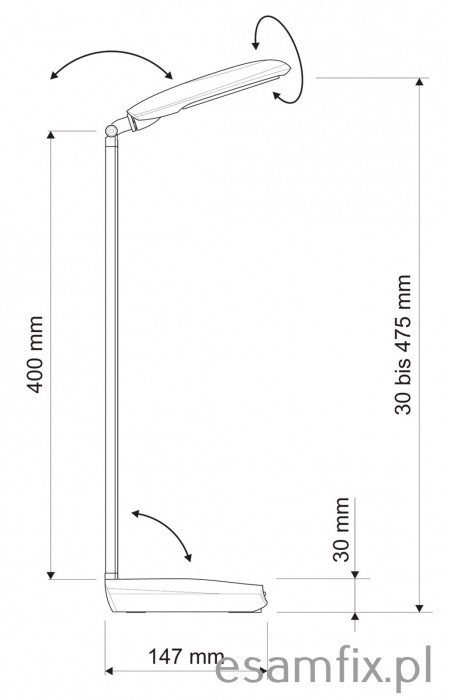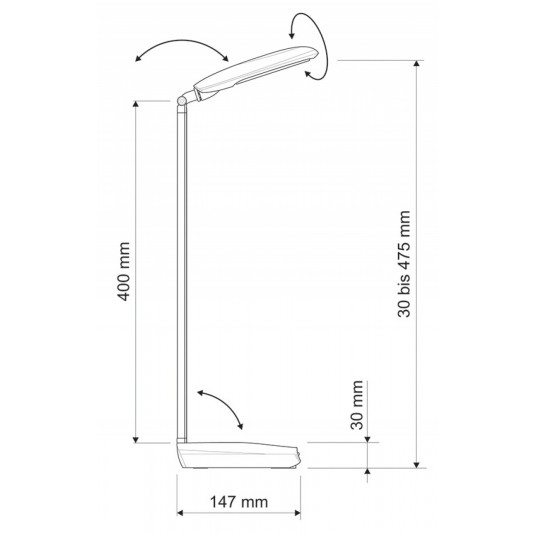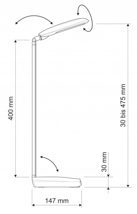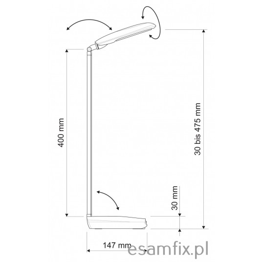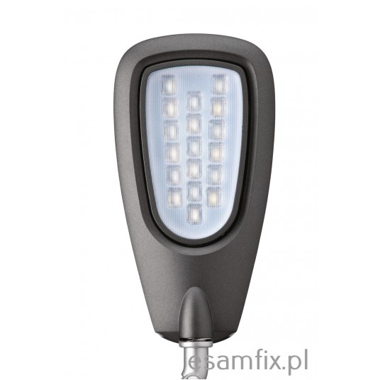 - płynna regulacja temperatury barwowej w zakresie 3100 - 6500 K - natężenie oświetlenia można regulować za pomocą 4-stopniowego ściemniacza - korzystny stosunek jakości do ceny - 80% niższe zużycie energii, niż w przypadku tradycyjnych żarówek - klasyczny wygląd - ramię i podstawa wykonane z aluminium, wykończenie matowe - opatentowana koncepcja bezpieczeństwa technicznego opracowana przez inżynierów MAUL - przyciski sterujące umieszczone na podstawie - 18 diod LED SMD: 9 emitujących światło ciepłe białe (3100 K) i 9 emitujących światło dzienne białe (6500 K) - diody są wbudowane i niewymienne - żywotność diod LED: 20000 godzin świecenia - klasa energetyczna: “A” - wyjątkowo niski pobór mocy: 7 W - natężenie oświetlenia: 1340 lux w odległości 35 cm - strumień świetlny: 370 lm - ramię o długości 40 cm wysokość w typowej pozycji roboczej - 47,5 cm - głowica lampy o wymiarach 15 x 7,9 cm, z możliwością obrotu o 270° i odchylenia o 130° - stabilna podstawa o wymiarach 19,5 x 14,7 cm, dociążona, z podkładką zabezpieczającą powierzchnię biurka