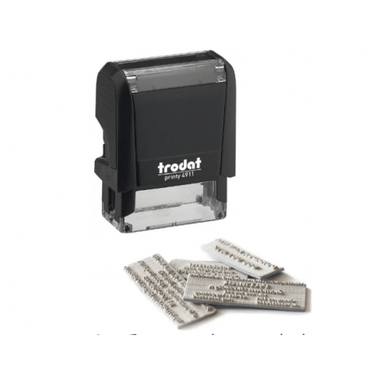 Kompletny zestaw gotowy do użycia, składa się z automatu Trodat, poduszki oraz gumki. Powierzchnia gumki stemplarskiej: 38 mm x 14 mm. Maksymalna ilość wersów: 4.