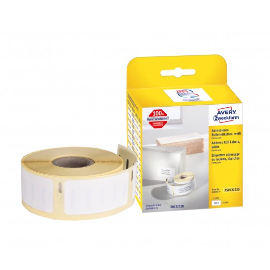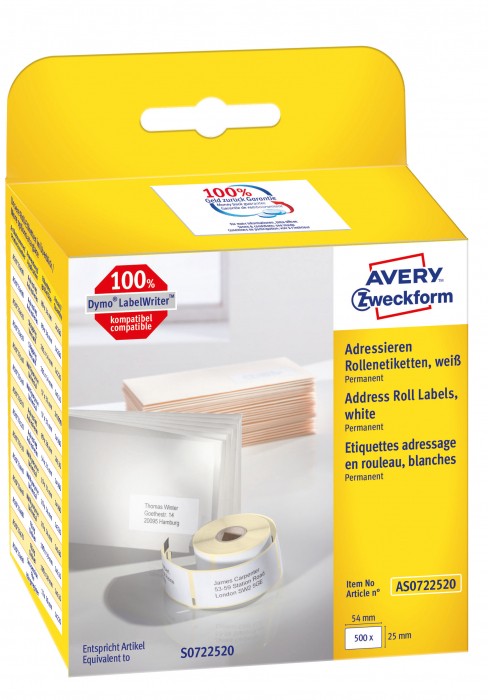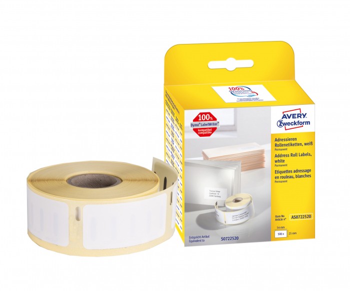 • Etykiety adresowe Avery Zweckform w rolce do drukarek termicznych • Są w 100% kompatybilne z: Dymo LW310; Dymo LW330T, LW400 Seria, LW450 Seria • Rozmiar: 25 x 54 mm • Klej: trwały • 1 rolka/op. • 500 etykiet/rolka • Kolor: białe • Gwarancja niezawodnego zadruku i pewnego przylegania etykiety • Idealne do wydruku oznaczeń wysyłkowych lub kodów kreskowych