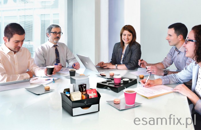 Pozwala w komfortowy i bezpieczny sposób dostarczyć do sali konferencyjnej kubki z gorącymii napojami lub wrzątkiem bez obawy o rozlanie, poplamienie czy poparzenie.