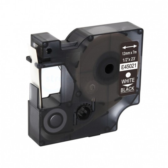 Taśma do Dymo D1 45021 (S0720610), zamiennik. O szerokości 12mm, długości 7m. Kolor taśmy czarny, kolor nadruku biały.