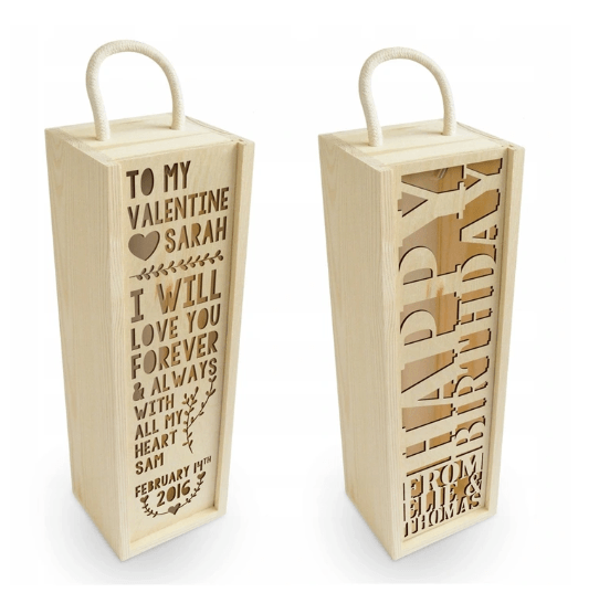 Sosnowa skrzynka na wino z grawerem i ażurem idealnie nadaje się jako upominek dla bliskich, partnerów biznesowych oraz klientów.