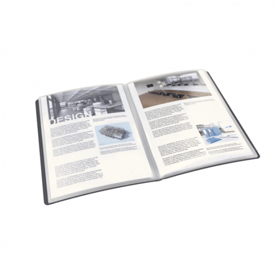 Wykonany z półprzezroczystego polipropylenu (PP) o grubości 0.36 mm, zawiera 20 koszulek na 40 kartek, zamkniętych w eleganckiej, twardej oprawie. Do segregowania i prezentowania dokumentów. Format A4.