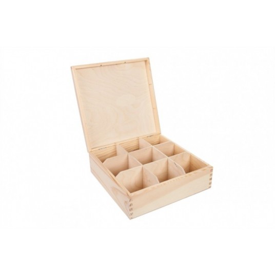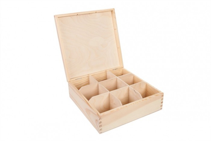 - W środku znajduję się jedna komora podzielona na dziewięć przegródek, które pozwolą posegregować rodzaje herbat.