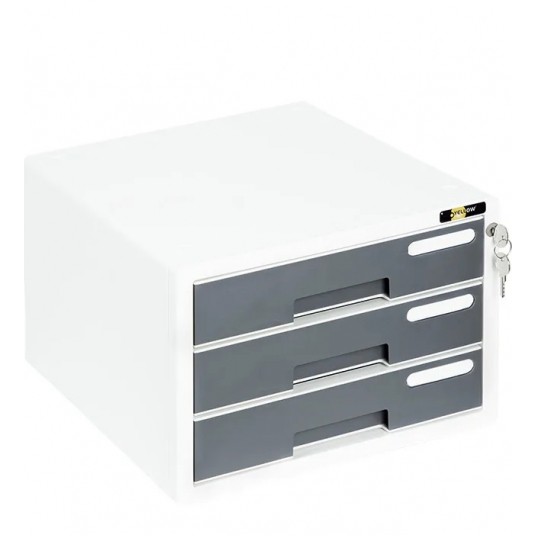 – plastikowa – zamykana na klucz: wszystkie szuflady – 3 szuflady A4 – okna opisowe – przydatna w realizacji przepisów RODO – wymiary: 210 x 353 x 300 mm – szara