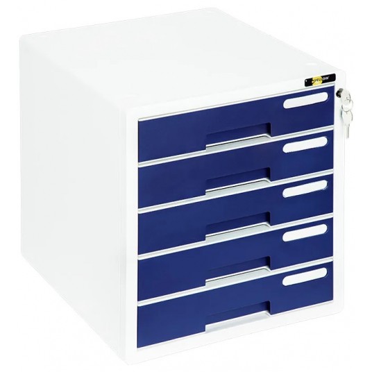 – plastikowa – zamykana na klucz: wszystkie szuflady – 5 szuflad A4 – okna opisowe – przydatna w realizacji przepisów RODO – wymiary: 330 x 353 x 300 mm – granatowa