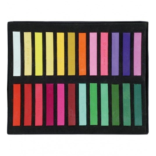 – suche kredki do nastrojowych rysunków na papierze – przekrój kwadratowy – intensywne, nasycone kolory – kwadratowy kształt i boczne ułożenie kredki pozwala na pokrywanie dużych obszarów za jednym pociągnięciem – można mieszać i cieniować kolory – aby uniknąć rozmazania rysunku, należy użyć utrwalacza – 24 kolory