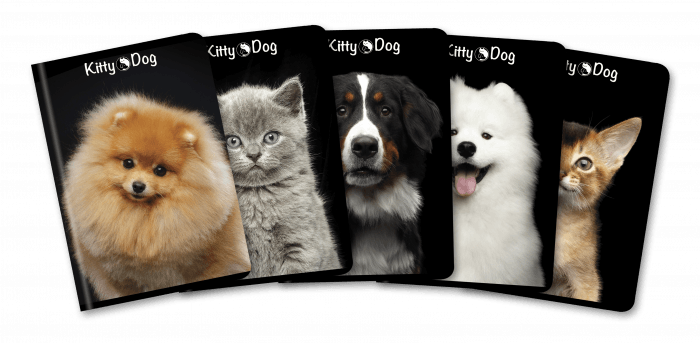• Wyjątkowa kolekcja zeszytów z wizerunkami psów i kotów • 5 różnych okładek w stonowanych, ciemnych kolorach • Miękka, laminowana okładka • Zszywany grzbiet • Papier o gramaturze 70 g/m2
