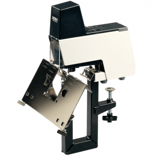 Zszywacz do zastosowań poligraficznych, do broszur, prospektów, zeszytów. Dzięki przestawianemu stolikowi może zszywać płasko i zeszytowo. Może pracować w zespołach kilku sztuk jednocześnie, po zastosowaniu dodatkowej szyny sprzęgającej (opcja dodatkowa). Komplet zawiera zszywacz ze stolikiem i pedałem wyzwalającym oraz wkładką do zszywek płaskich.