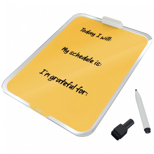 Szklana tabliczka na biurko Dzięki Leitz Cosy poczujesz się jak w domu wszędzie tam, gdzie zaprowadzą Cię obowiazki zawodowe. Dzięki minimalistycznemu wzornictwu i zachęcającym kolorom możesz dodać stylu i koloru do swojego miejsca pracy. Tabliczka na biurko to najlepsze narzędzie do robienia notatek. Ta najwyższej jakości tabliczka jest idealnym dodatkiem do domu lub biura, zapewniając relaks i produktywność przez cały dzień. Tabliczka suchościeralna na biurko idealna do robienia notatek. tabliczka na biurko, tabliczka, szklana tabliczka, szklana tabliczka na biurko, szklana tabliczka na biurko do robienia notatek, tabliczka na notatki Szklana tablica suchościeralna jest idealna robienia notatek lub zapisywania przypomnień Kompaktowy rozmiar formatu A4, dzięki czemu idealnie mieści się na biurku Napisz lub przyklej swoje notatki bezpośrednio na szklanej powierzchni tablicy Powierzchnia wykonana jest z hartowanego bezpiecznego szkła o bardzo dobrej ścieralności i wysokiej odporności na plamy atramentu, ślady pióra, zadrapania i wgniecenia Bezramowa konstrukcja maksymalizuje przestrzeń do pisania Zintegrowany uchwyt na długopis do przechowywania długopisu i gąbki W zestawie mini marker z wbudowaną gumką na wieczku Wymaga okresowego czyszczenia, aby zapewnić najlepszą wydajność powierzchni tablicy Opakowanie bez plastiku W kolekcji Leitz Cosy znajdziesz produkty łączące najwyższą jakość z komfortem, jaki zapewnia domowy styl.