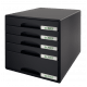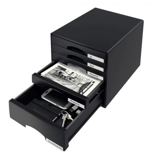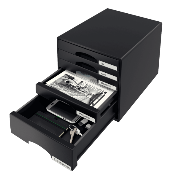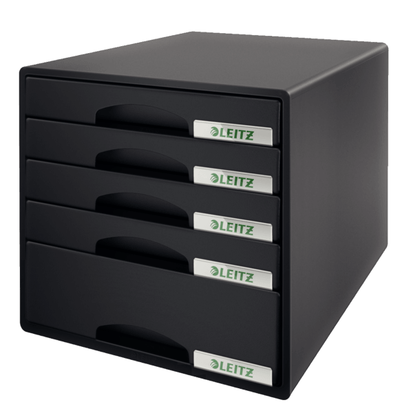 Atrakcyjny, mocny pojemnik do przechowywania dokumentów, artykułów biurowych, itp. Wzornictwo i kolorystyka spójna z linią produktów na biurko Leitz Plus. Wyposażony w 5 szuflad (1 duża i 4 małe). Format A4 Maxi.
