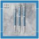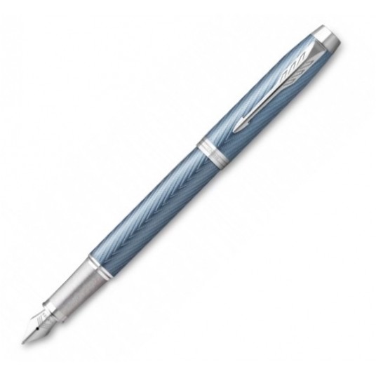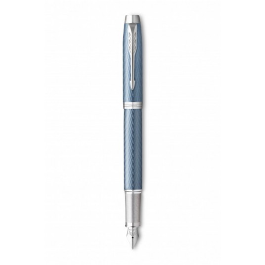 Korpus i nasadka pokryte wyrazistym, metalicznym lakierem w kolorze niebieskoszarym z grawerowaniem w kultową jodełkę i z chromowanym wykończeniem, uzupełnione klipsem w kształcie strzałki PARKER