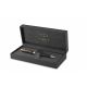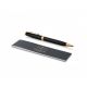 Cechy długopisu: czarny, matowy kolor, złote wykończenia, mosiężny korpus, potrójny pierścień z logo marki Parker, stalowy klip.