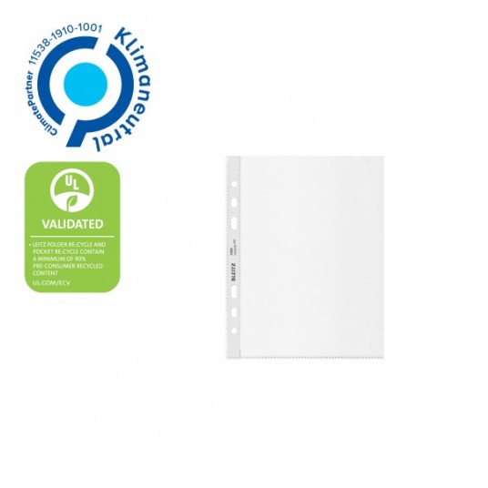 Koszulka A5 Leitz Recycle Przyciągająca wzrok, najwyższej jakości koszulka na dokumenty wytowrzona z materiałów pochodzących z recyklingu do łatwego przechowywania i odczytu dokumentów.