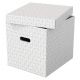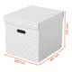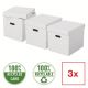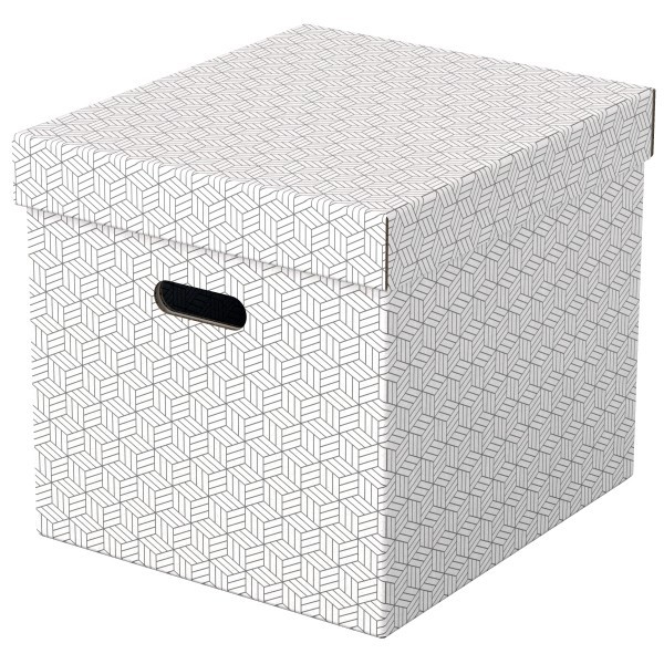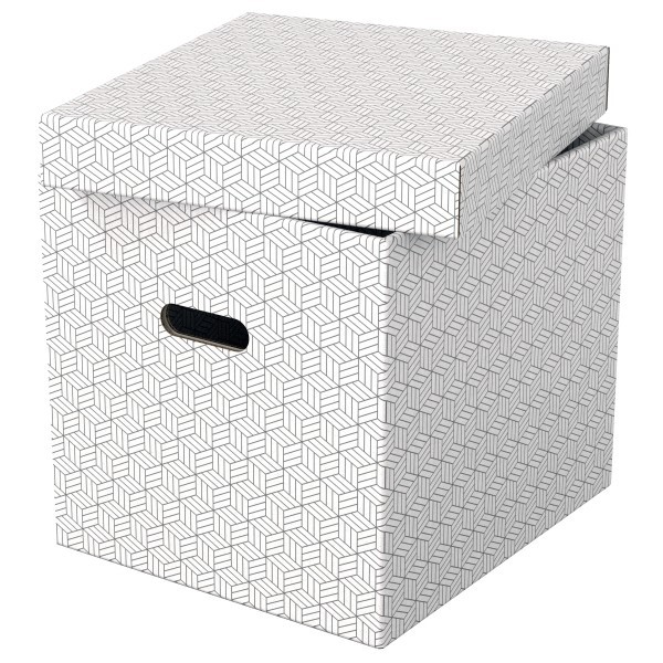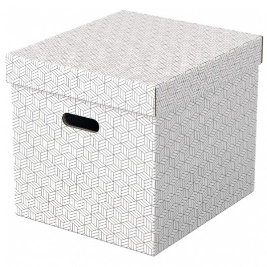 Zestaw trzech dużych tekturowych pudełek do przechowywania w kształcie sześcianu, ze stylowym i nowoczesnym geometrycznym wzorem na powierzchni.