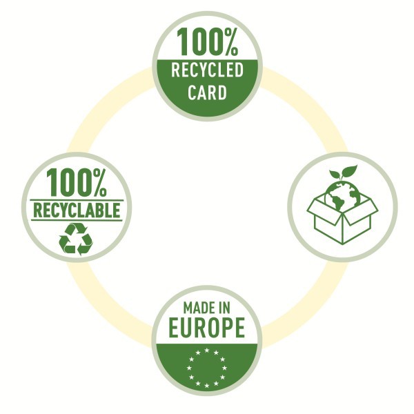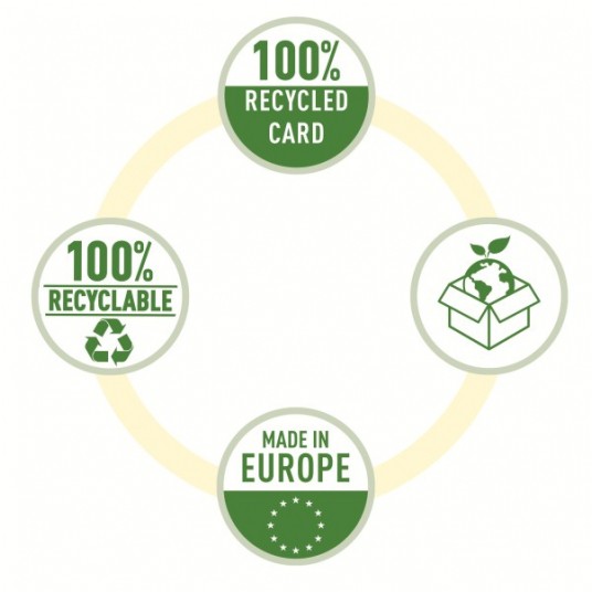 Wykonane z mocnej i wytrzymałej tektury, w 100% pochodzącej z recyklingu i w 100% nadającej się do ponownego przetworzenia.