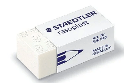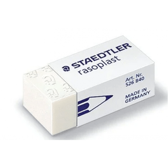 Gumka do ścierania biała Staedtler Rasoplast nie zawiera latexu, każda jest zapakowana w osobną folię. Gumka pozostawia mniej ścinek, doskonale usuwając z papieru lub folii kreślarskiej grafit nie niszcząc przy tym powierzchni ścieranej.