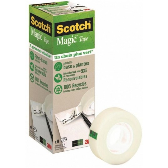 Opakowanie zawiera 9 rolek taśmy klejącej Scotch® Magic™ Greener Choice, w rozmiarze 19 mm x 33 m.