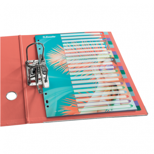Wytrzymałe i stylowe przekładki z indeksami, w formacie A4, idealne do porządkowania dokumentów w segregatorach z mechanizmem dźwigniowym oraz ringowych.