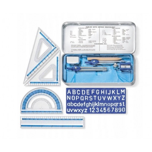 Szkolny zestaw geometryczny w metalowym pudełku.