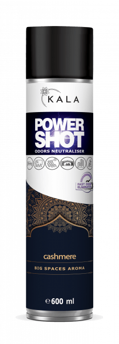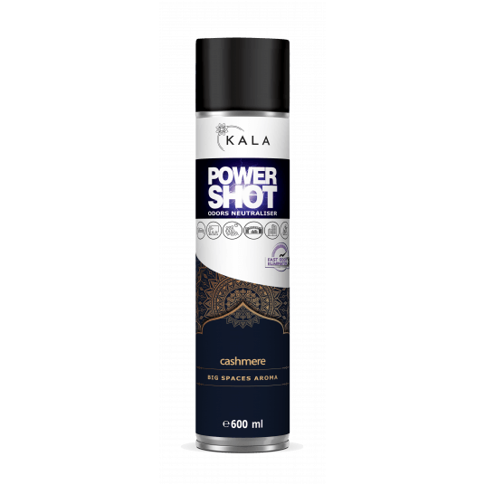 Neutralizator nieprzyjemnych zapachów, aromatyzer, odświeżacz Kala POWER SHOT zapach cashmere 600 ml to prestiżowy zapach tajemniczości orientu, w którego składzie odnajdziemy orientalną wanilię, a także nuty żywiczne, drzewne, ambrowe. Cashmere otuli Cię swym aromatem niczym delikatny szal.