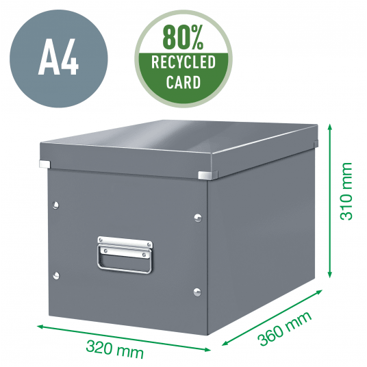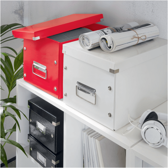 Sześcienna konstrukcja pudła zapewnia dodatkową pojemność. Idealne do przechowywania wysokich i okrągłych przedmiotów. Doskonale dopasowuje się do standardowych mebli sześciennych (np. Kallax z Ikei). Wykonane z wysokiej jakości wytrzymałego kartonu. Laminowana powierzchnia i metalowe elementy narożne zapewniają solidną ochronę. Trwałe metalowe uchwyty ułatwiają przenoszenie. Składane w celu zaoszczędzenia miejsca, gdy nie jest używane. Nowoczesne wzornictwo świetnie pasuje do każdego biura.