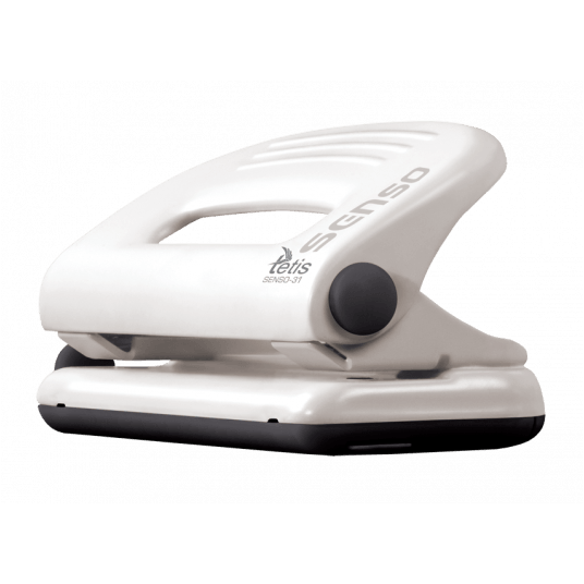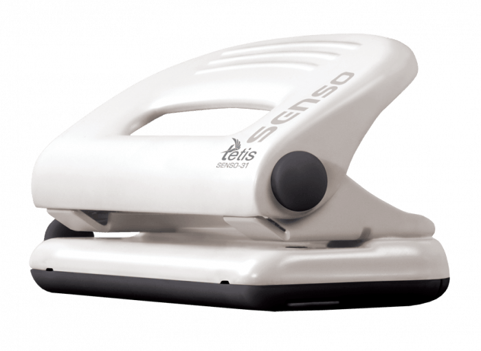 - Metalowy dziurkacz biurowy z wykończeniami z tworzywa sztucznego.