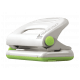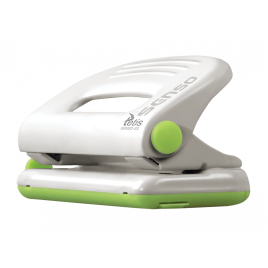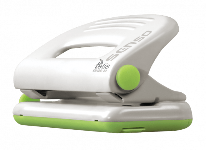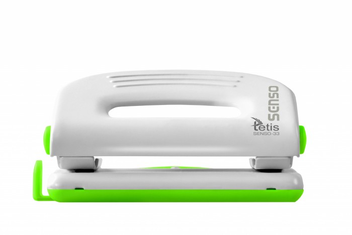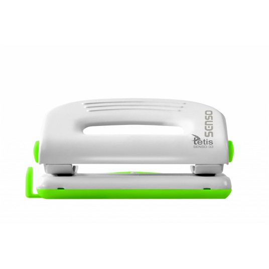 - Metalowy dziurkacz biurowy z wykończeniami z tworzywa sztucznego.