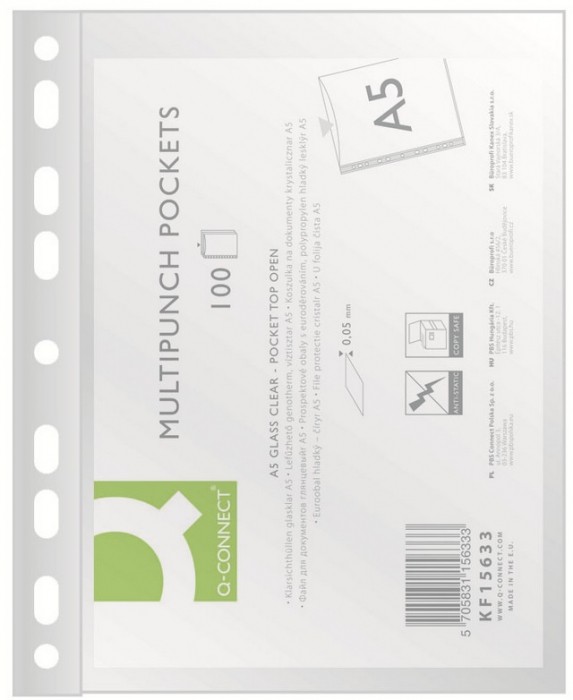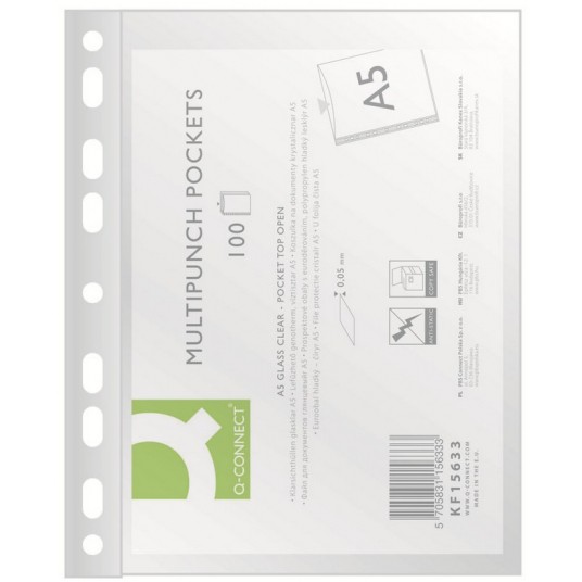 - wykonane z gładkiej folii - transparentne - otwarte na górze - antyelektrostatyczne - odpowiednie do dokumentów w formacie A5 - ilość dziurek do wpięcia: 9 - 50 mic.: A5 o wymiarach 174 x 215 mm