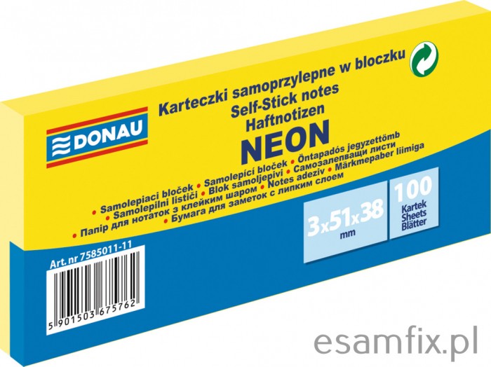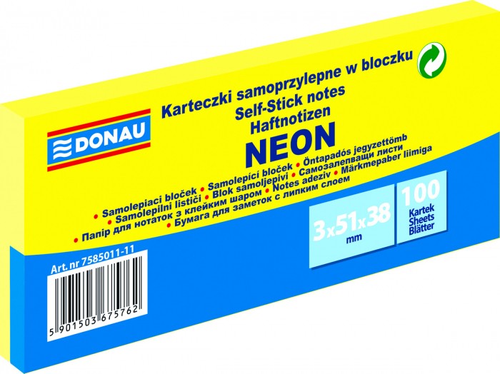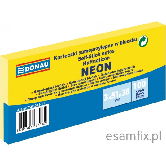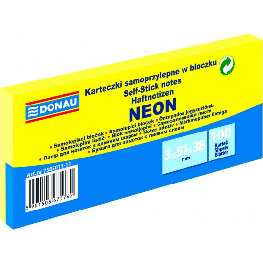 Bloczek samoprzylepny DONAU, 38x51mm, 3x100 kart., neon, żółty