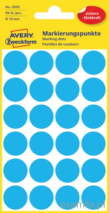 Kółka do zaznaczania O 18 mm, niebieskie etykiety papierowe, etykiety okrągłe z trwałym klejem, etykiety do oznaczenia 96 etyk. / op., Avery 3005