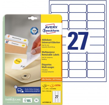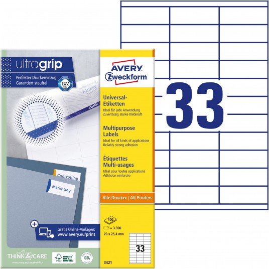 Trwałe etykiety papierowe 70 x 25,4 mm, białe etykiety samoprzylepne, etykiety do druku 100 ark. / op., Avery 3421